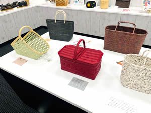 古くから紡がれてきた染色技術を応用したかすり染にて製作された、和の雰囲気を感じる鉄線編みのかごバッグ、斜めあじろ編みの市場かご、ファインネットにかすり染を通して製作のバッグなど多数を展示。